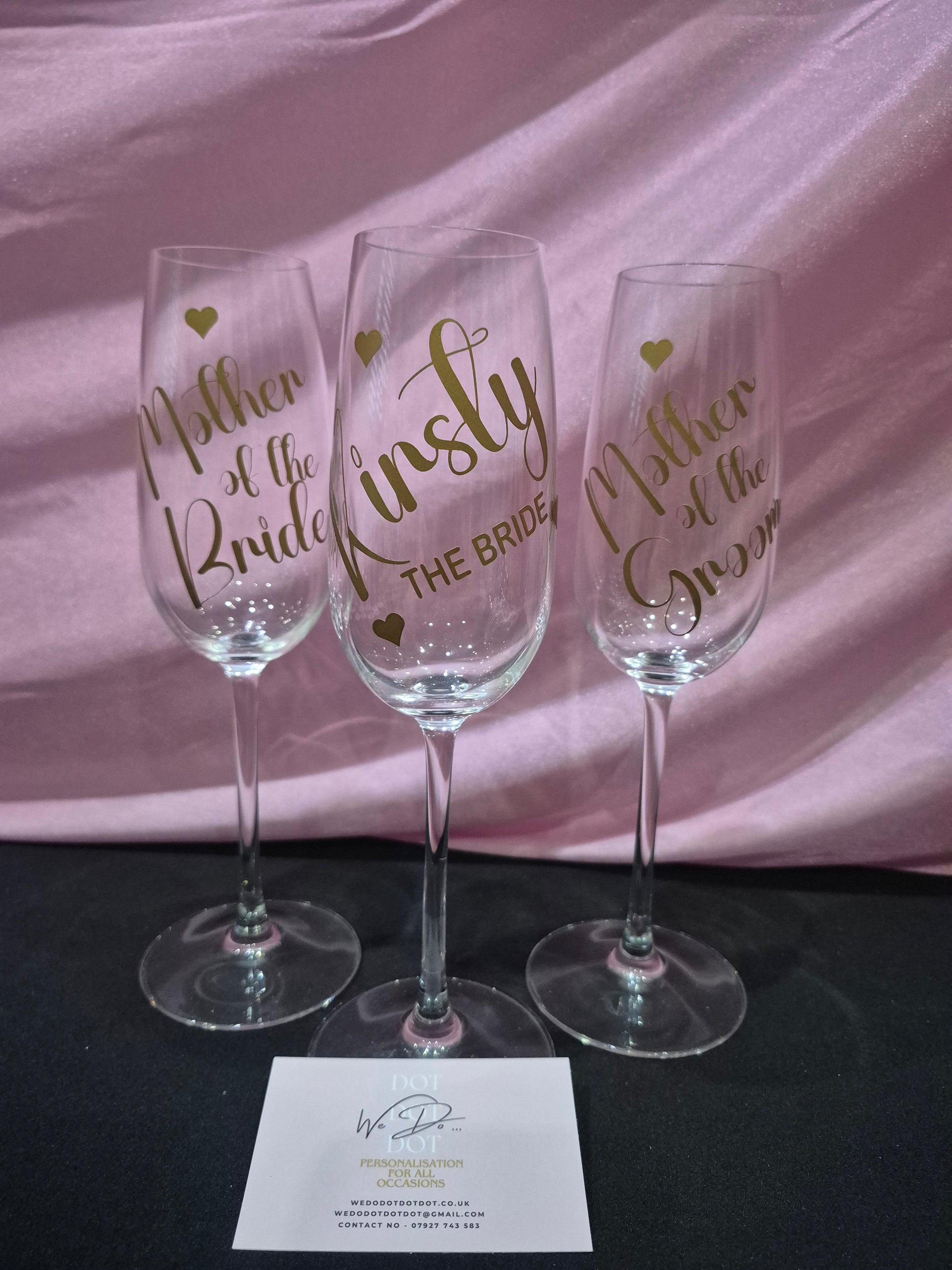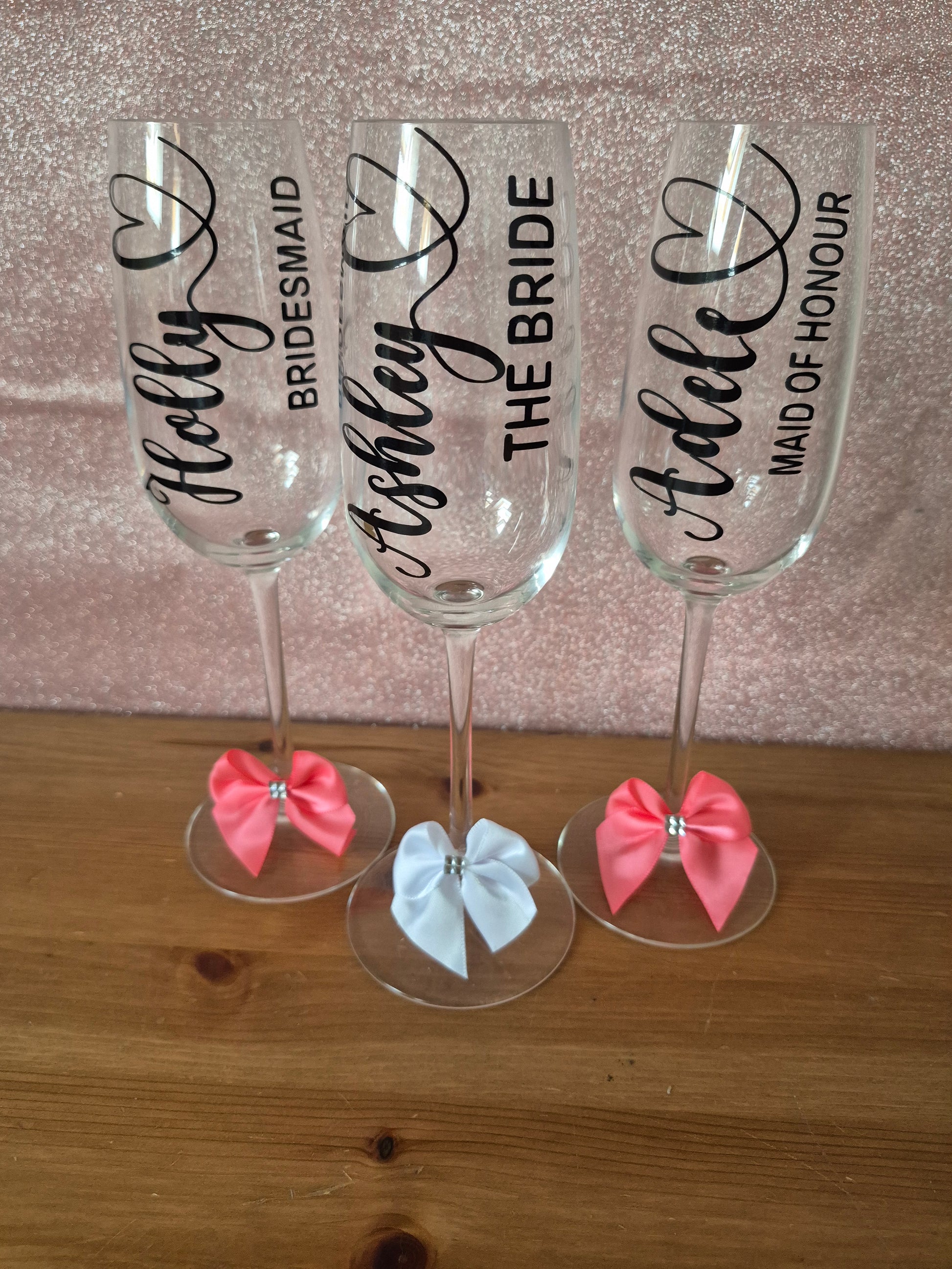 Champagne flutes are personalised with vinyl stickers. The photos show personalised flutes with names and roles but this can be changed to anything you’d like. Please state what wording you’d like in the fancy writing and which you’d like in the capital writing when ordering, for example -